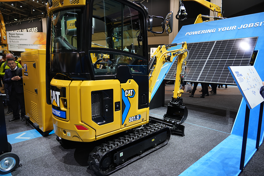 展區內,一臺2噸級Cat 301.9電動微型挖掘機的正前方擺放了一座斜面太陽能板,側面擺放充電設施。
