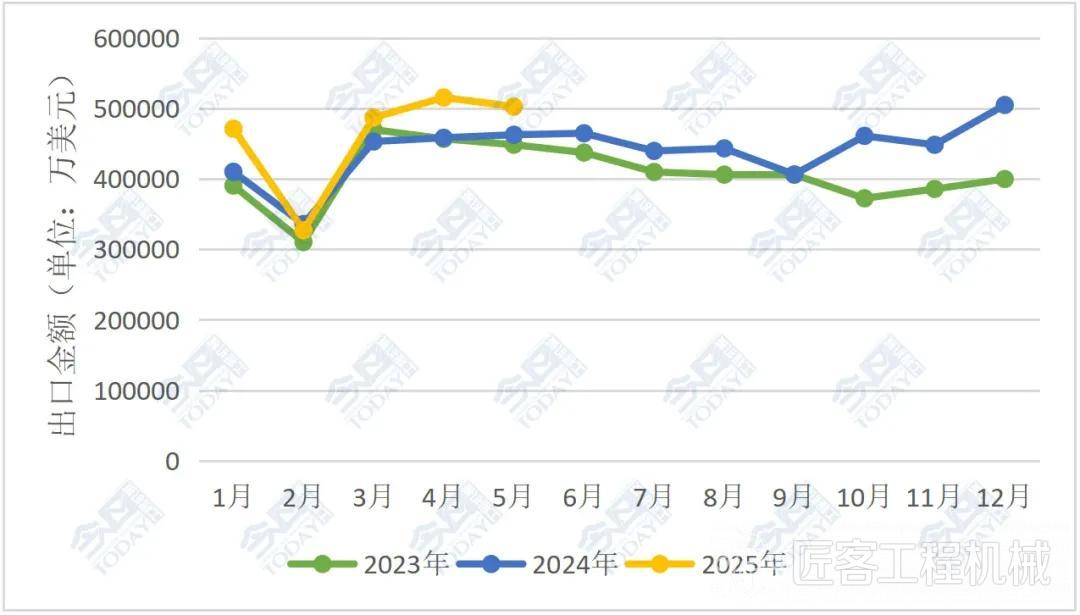 環比來看,2025年5月我國挖掘機(含履帶挖掘機和輪式挖掘機)出口總額為8.89億美元,較2025年4月的8.46億美元上升5.05%。