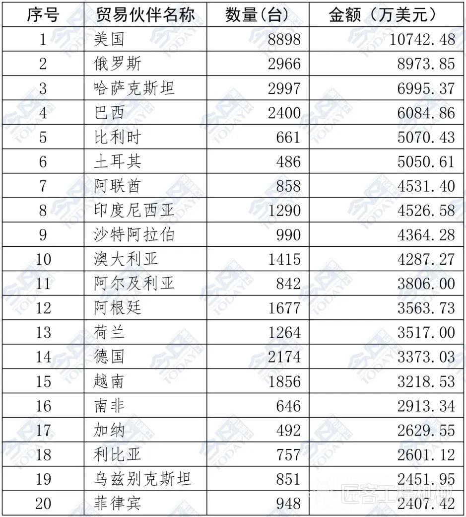 對美國、俄羅斯和哈薩克斯坦出口位列前三。其次依次為巴西、比利時、土耳其、阿聯酋、印度尼西亞、沙特阿拉伯、澳大利亞位列前十。2025年5月裝載機出口額排名前二十位國家和地區具體情況如表3所示。