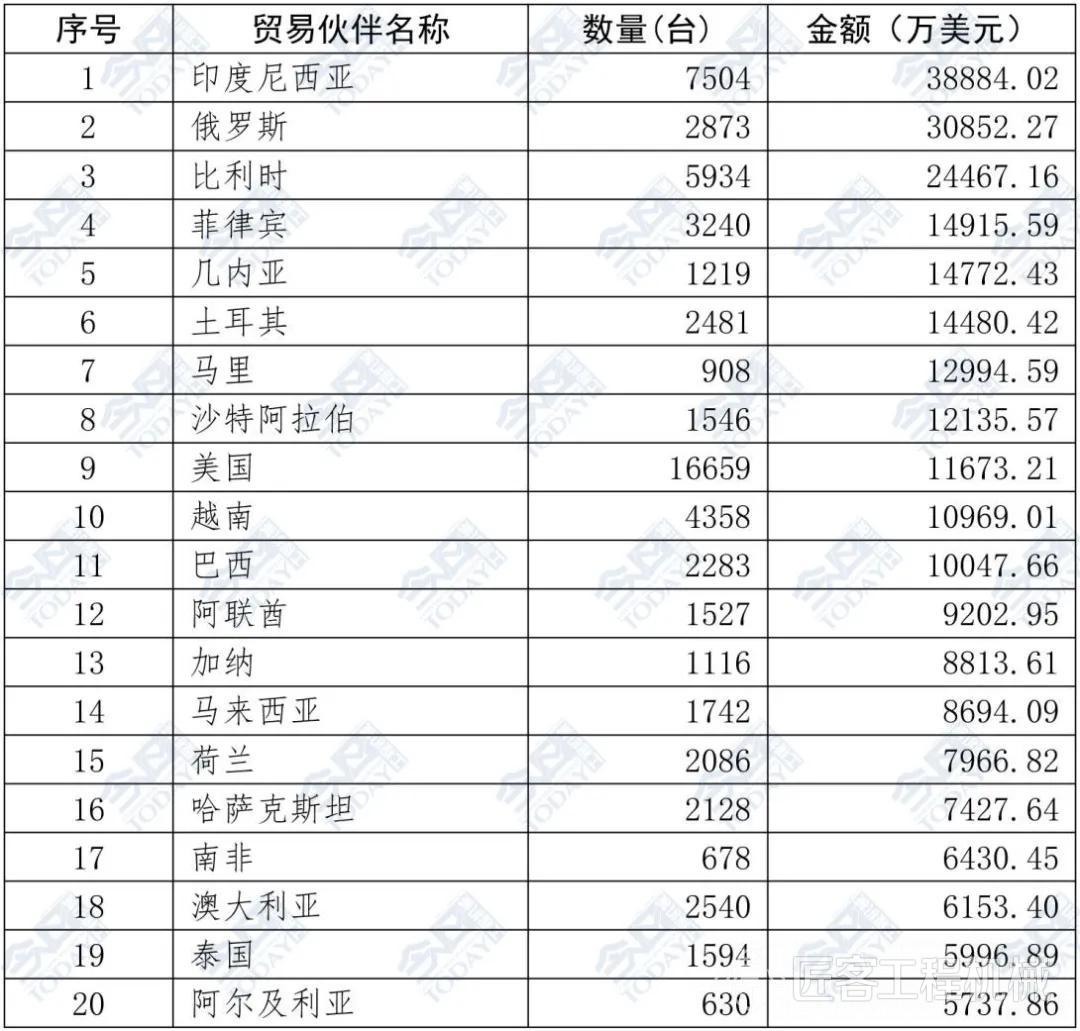 表2 2025年1—5月挖掘機出口額排名前二十位國家和地區