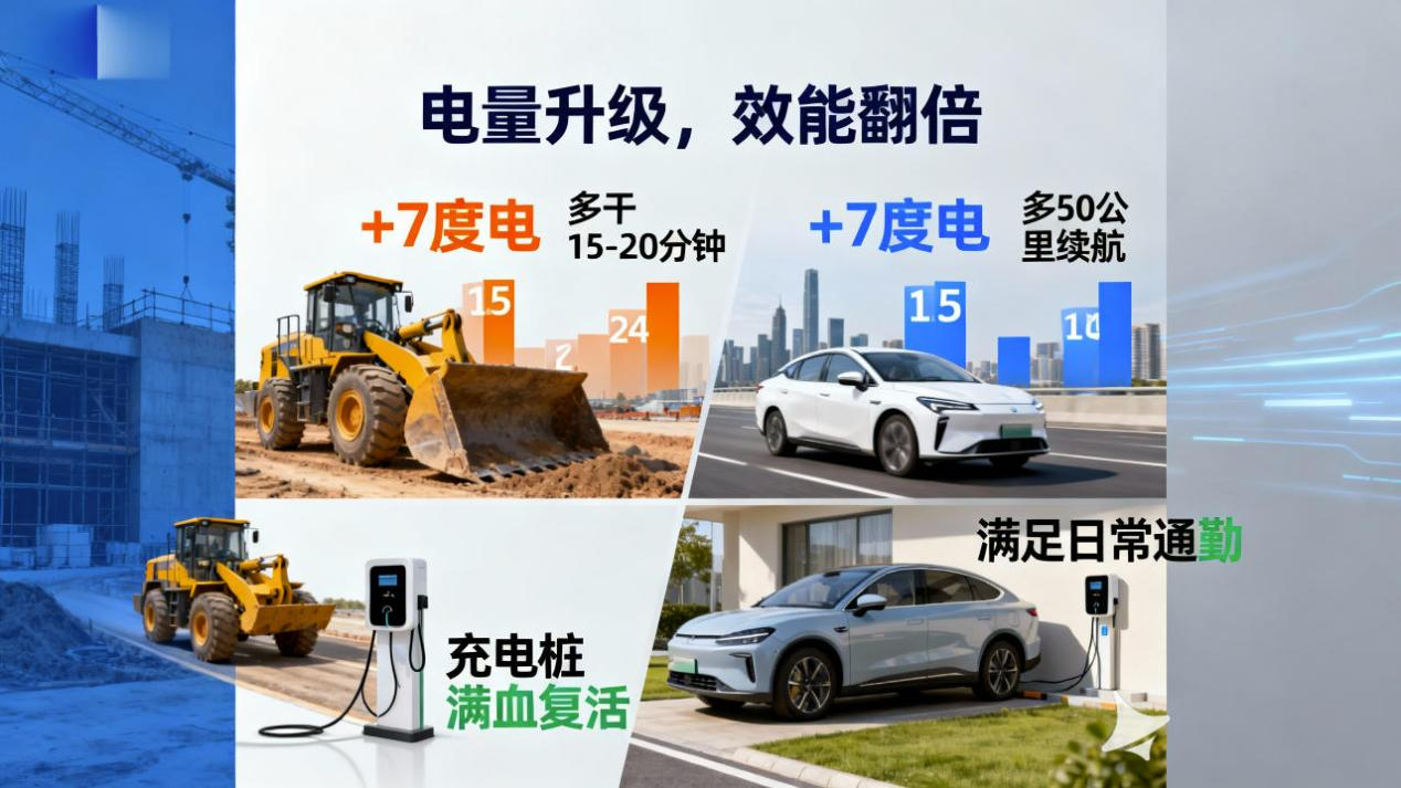 對(duì)主流電動(dòng)汽車(chē)而言,每度電約可支持5–8公里的續(xù)航;增加7度電,意味著額外獲得35–56公里的行駛里程,相當(dāng)于從容應(yīng)對(duì)從市中心到郊區(qū)的通勤距離。而在電動(dòng)裝載機(jī)上,這多儲(chǔ)備的7度電,則代表每次充滿電后可多工作15–20分鐘——日積月累,其經(jīng)濟(jì)價(jià)值不容小覷。尤其在野外作業(yè)中突遇電量告急,這7度電,足以讓設(shè)備開(kāi)到充電站“滿血復(fù)活”,持續(xù)奮戰(zhàn)。
