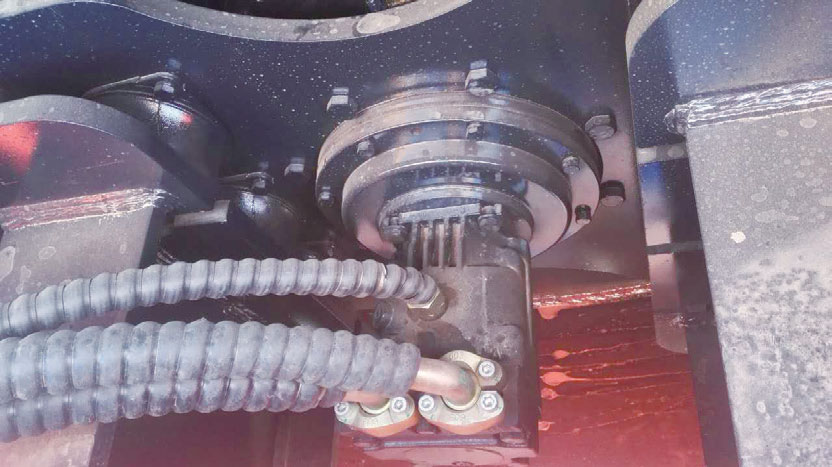 該機具有雙頻雙振功能,靜線壓力以及激振力大,作業效率高。振動軸承采用專用振動軸承,飛濺與水車結構的組合潤滑,具有自主專利的振動軸承冷卻技術,保證了軸承壽命長,可靠性高。振動室內可加注約12L 機油, 使日常維護保養費用降低。前輪振動工作時,機油由調幅裝置旋轉和前輪自轉時舀油裝置(水車結構)兩種方式對振動軸承組合潤滑。當機器原地啟振時,也不會對軸承造成損傷。